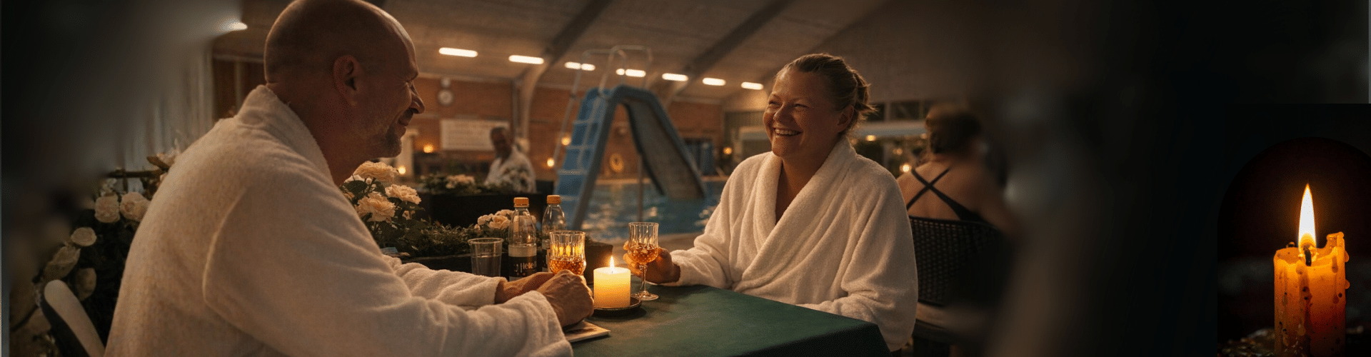 I svømmehallen står et bord klar til jer langs vandkanten. Bordet er jeres resten af aftenen.